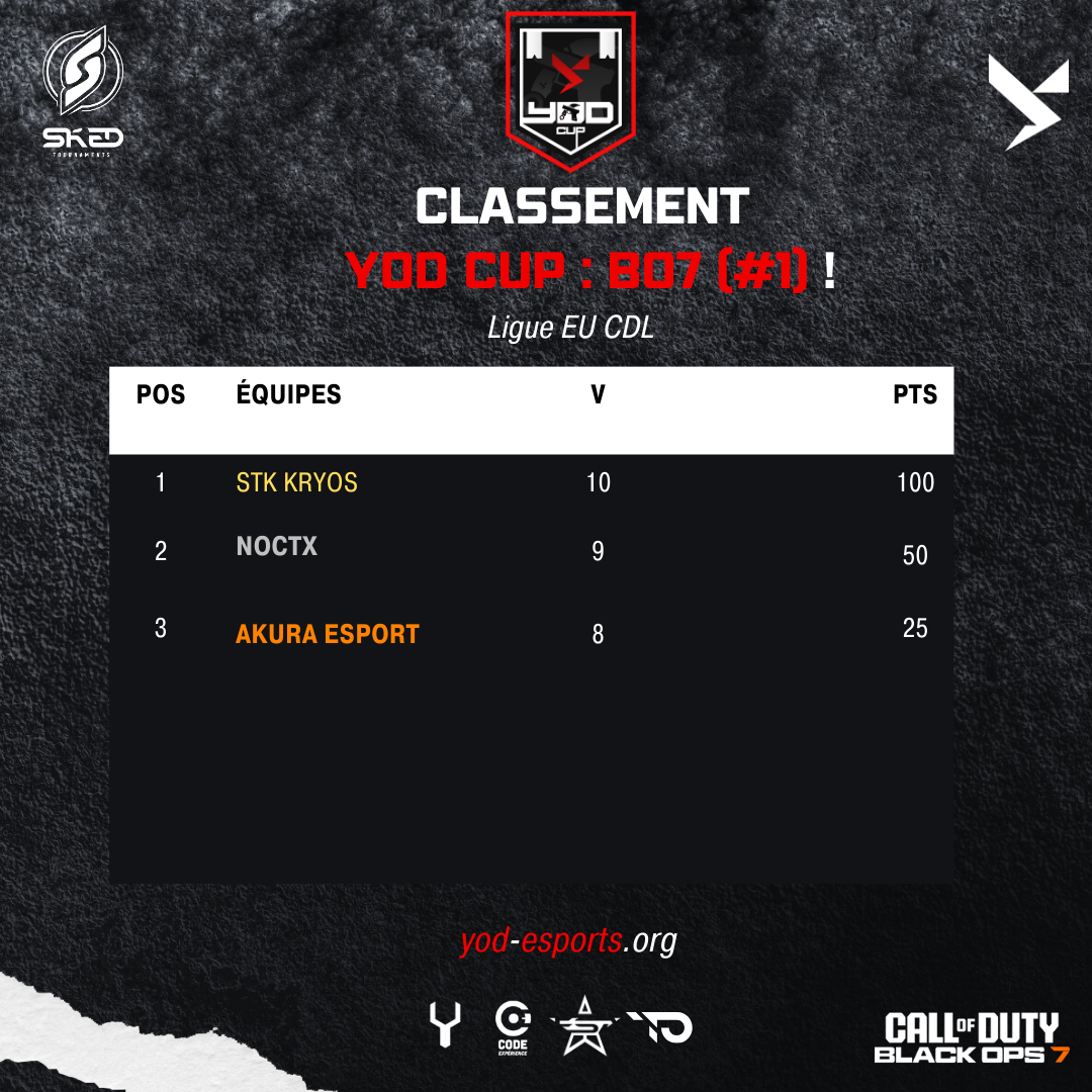 La YoD Cup | COD EU Championnat est une ligue cross-plateforme (PC/Consoles) sur Call of Duty dans laquelle chaque équipe doit affronter une fois chacune équipe avec un système de point pour se classer dans le classement général ! Chaque équipe a plus d’un mois pour effectuer la totalité de ses matchs face à toutes les autres équipes participantes.